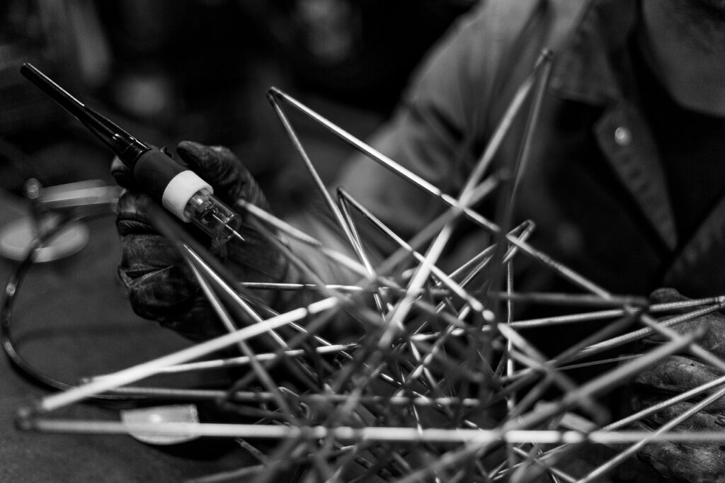 曲げ、溶接、塗装、研磨といった工程を、それぞれの分野を極めた職人たちと分担しながら、一つのプロダクトをつくり上げています。